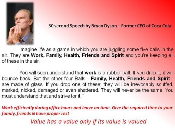 ನಿಮ್ಮ ಬಳಿ  ಕೆಲಸ, ಕುಟುಂಬ, ಆರೋಗ್ಯ, ಗೆಳೆಯರು ಮತ್ತು ಉತ್ಸಾಹ ಎಂಬ ೫ ಚೆಂಡುಗಳಿವೆ. ಈ ಎಲ್ಲಾ ಚಂಡುಗಳನ್ನು ಗಾಳಿಯಲ್ಲಿಯೇ ಹಾರಿಸುತ್ತ ಕೆಳಬೀಳದಂತೆ ಆಡುವುದೇ ಬದುಕು.