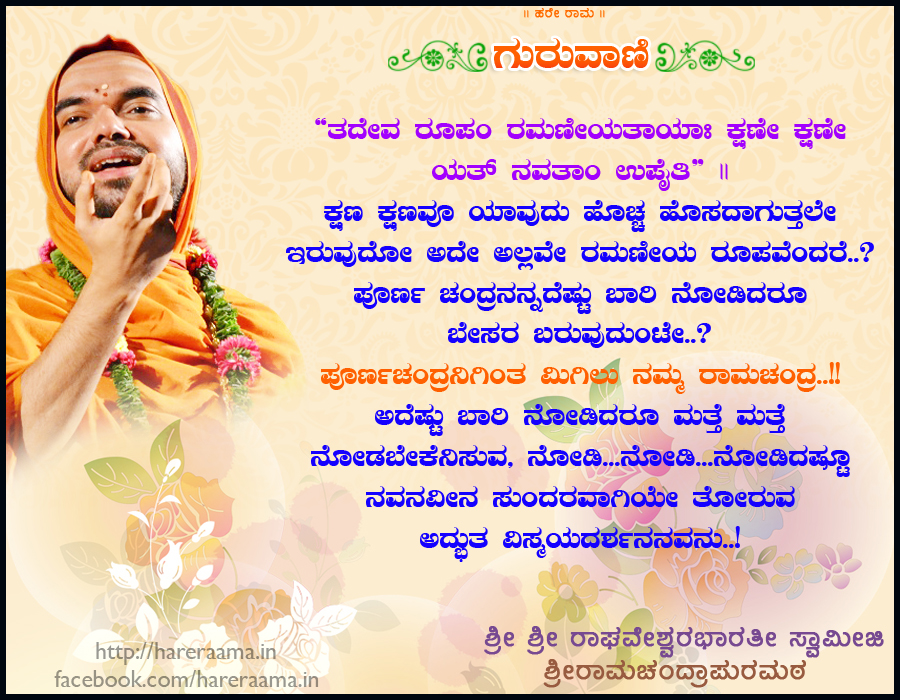 harerama kusumakomala ramachandira. karunasagara raghaveshwara. poornachandira ramachandira premasagara raghaveshwara. prathibariyu shriramadarshanadalli naveenyate. prathi bariya ashirvachanadalli naveenyate mathravalla manamuttuva shyli.shishyarannu tidduva reethi. ramadevarannu nodidashtu saladu. shrigurugala mathugalannu kelidashtu saladu. harerama.