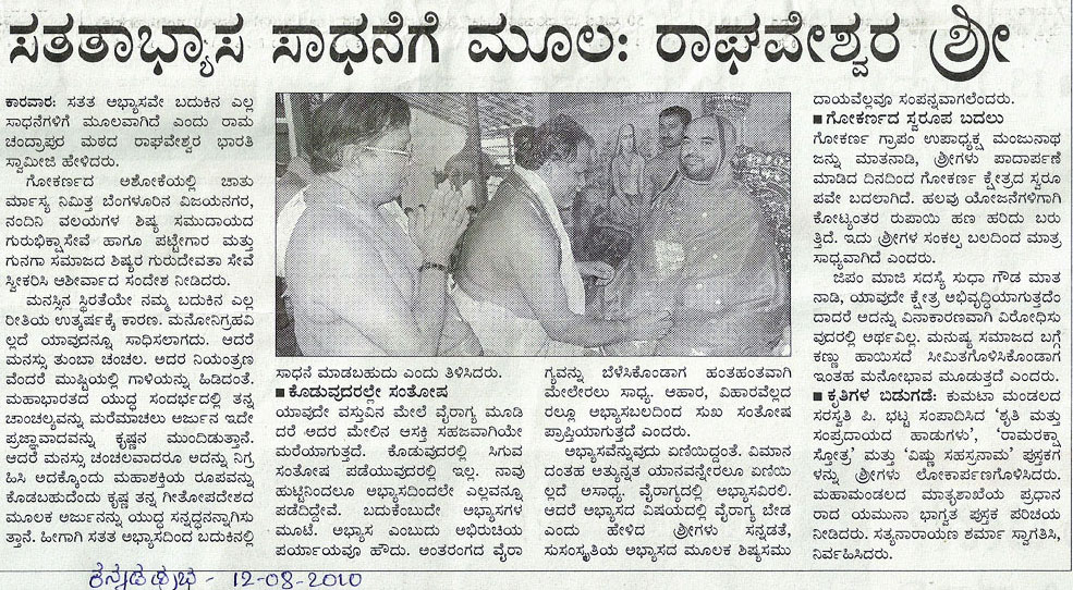 12 ಆಗಸ್ಟ್ 2010 ಕನ್ನಡ ಪ್ರಭಃ ಸತತಾಭ್ಯಾಸ ಸಾಧನೆಗೆ ಮೂಲಃ ರಾಘವೇಶ್ವರ ಶ್ರೀ