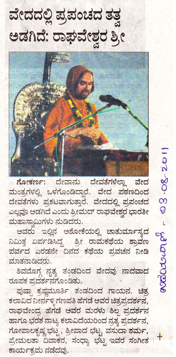 03 ಆಗಸ್ಟ್ 2011 ಉದಯವಾಣಿ: ವೇದದಲ್ಲಿ ಪ್ರಪಂಚದ ತತ್ವ ಅಡಗಿದೆ: ರಾಘವೇಶ್ವರ ಶ್ರೀ